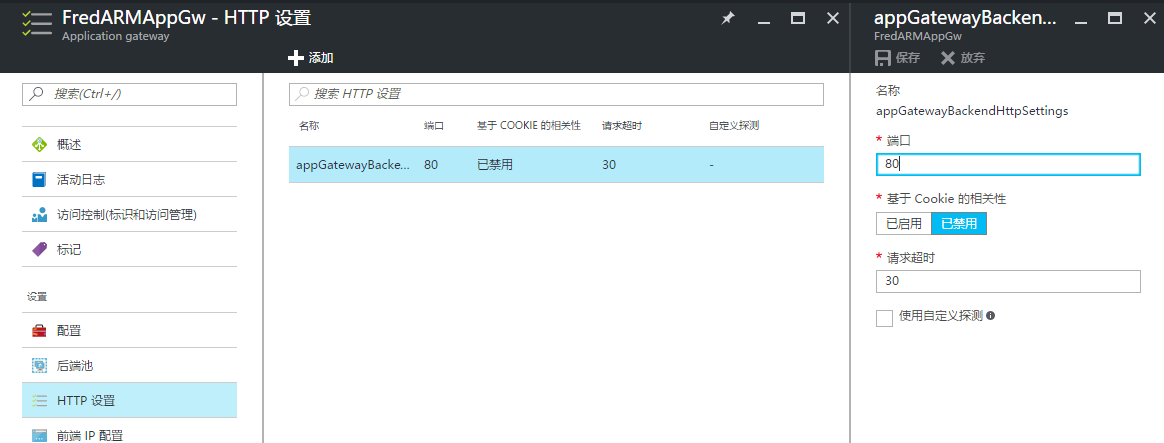 对于使用 ARM 模式创建的应用程序网关,我们可以直接在 Portal 直接进行配置。如下图所示,点击 HTTP 设置,选中某一条 HTTP 设置可以在请求超时部分进行配置。