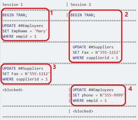 CREATE TABLE Employees ( EmpId INT IDENTITY primary key, EmpName VARCHAR(16), Phone VARCHAR(16) ) GO INSERT INTO Employees (EmpName, Phone) VALUES ('Martha', '800-555-1212'), ('Jimmy', '619-555-8080') GO CREATE TABLE Suppliers( SupplierId INT IDENTITY primary key, SupplierName VARCHAR(64), Fax VARCHAR(16) ) GO INSERT INTO Suppliers (SupplierName, Fax) VALUES ('Acme', '877-555-6060'), ('Rockwell', '800-257-1234') GO然后在 SSMS 中开启两个空的查询窗口,把 Session 1 下面的代码放到一个查询窗口,把 Session 2 下面的代码放到另外一个查询窗口,然后按照下图的顺序执行: