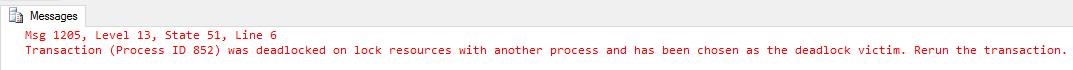 通过步骤 1、2 我们会收到一个 Msg 1205 报错,显示其中一个事务完成,另外一个事务被选为 Deadlock Victim.