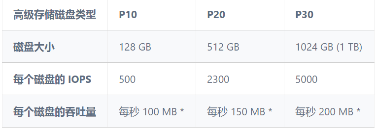 根据 Azure 高级存储磁盘的说明,当前 Azure 共有三种高级存储:P10, P20, P30。 这三者是怎么区分的呢? 实际上,Azure 根据磁盘的大小来划分该磁盘所属的性能类型。