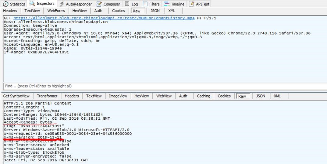 在播放媒体文件时我们使用 fiddler 工具进行抓包,发现默认使用的就是最原始的版本 2009-09-19,另外可以看到客户端有发送 Range 头,但是服务端返回里面没有 accept-ranges 头,所以就相当于没有指定 API 版本( un-versioned )。