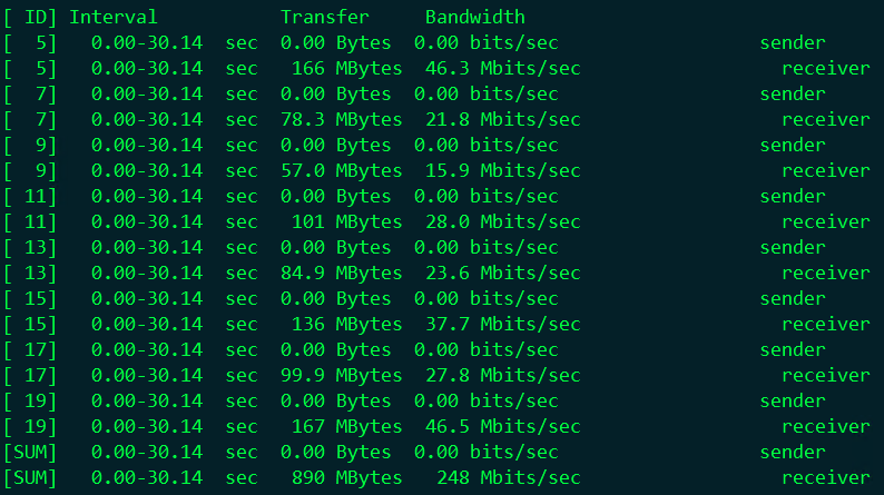 对比这两个结果,我们能看出来 4 个数据流并发时,总带宽是 163Mb/s。8 个数据流并发时,总带宽达到了 248Mb/s。这说明 4 个数据流并发时,并没有测试出最大带宽。所以在实际测试时,可以通过多次调整并发数据流数量,来获取真实的最大带宽值。