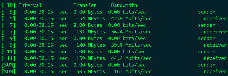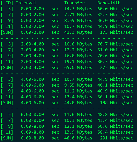 可以看到 iPerf 在不同的时间间隔内,都完整的显示了每个数据流传送的数据大小以及带宽。然后在第 5 行显示当前时间间隔内的传送的总数据大小和总带宽。