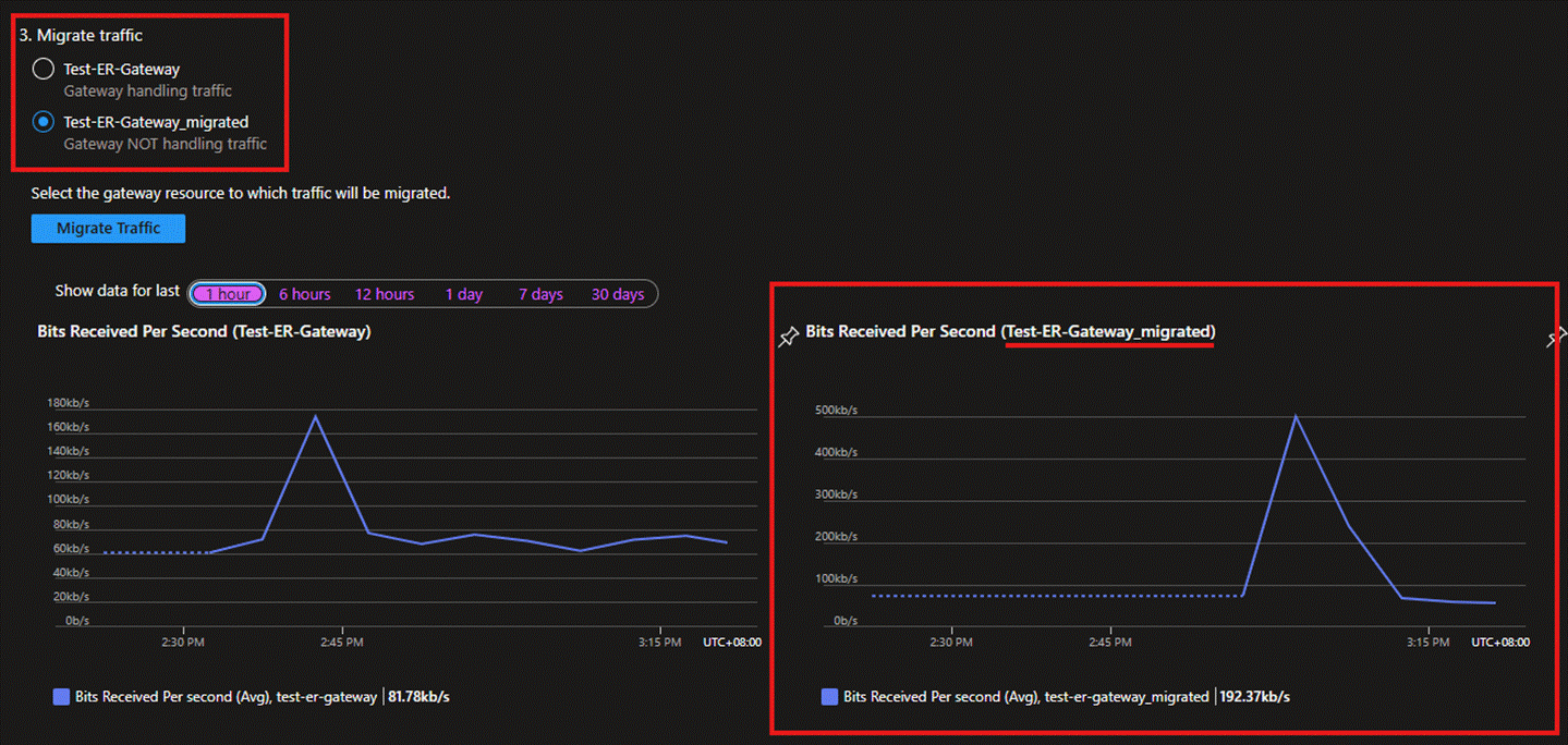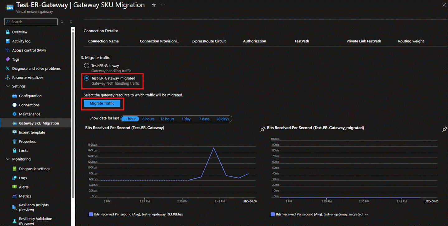- After completing the above connection migration, under normal circumstances, the page will display that the new ExpressRoute Gateway is already handling traffic. Besides, the chart of the new ExpressRoute Gateway on the lower right-hand side will also show that it has started receiving traffic. It is also recommended that you use devices in your on-premises network to run connectivity tests with the VMs in Azure. For information on the relevant testing tools, please refer to the documentation PsPing - Sysinternals | Microsoft Learn.