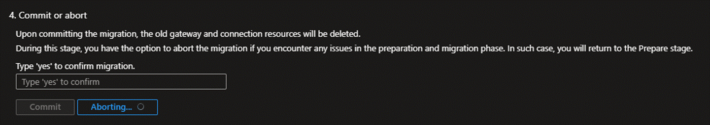- At this point, you may click the "Abort" button shown in the screenshot below, and the migration tool will fully revert to the invalidated state. The previously newly created ExpressRoute Gateway will also be deleted.