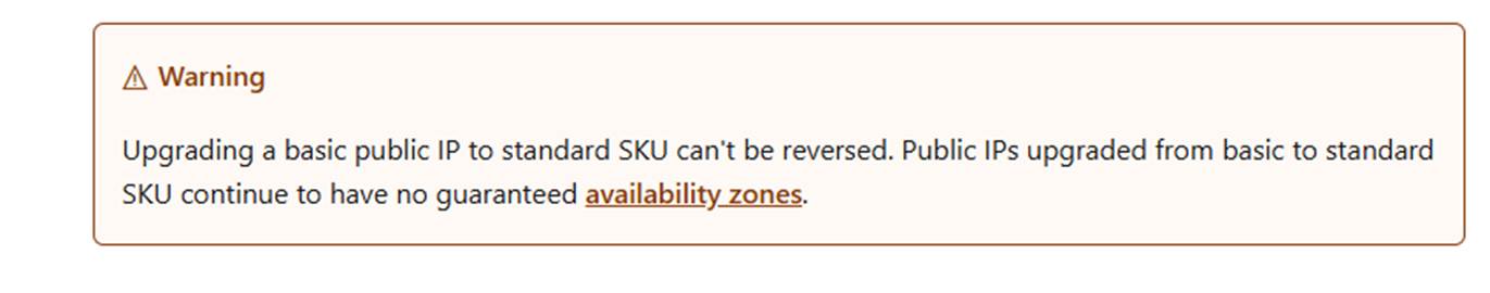 The basic public IP that needs to be upgraded must be assigned statically. If an attempt is made to upgrade a dynamically assigned IP address, a warning will be received indicating that the IP cannot be upgraded. Before the upgrade, the IP address allocation should be changed to static. The standard SKU public IP addresses do not support dynamic IP allocation. Currently, there are no other alternatives except for static allocation.
