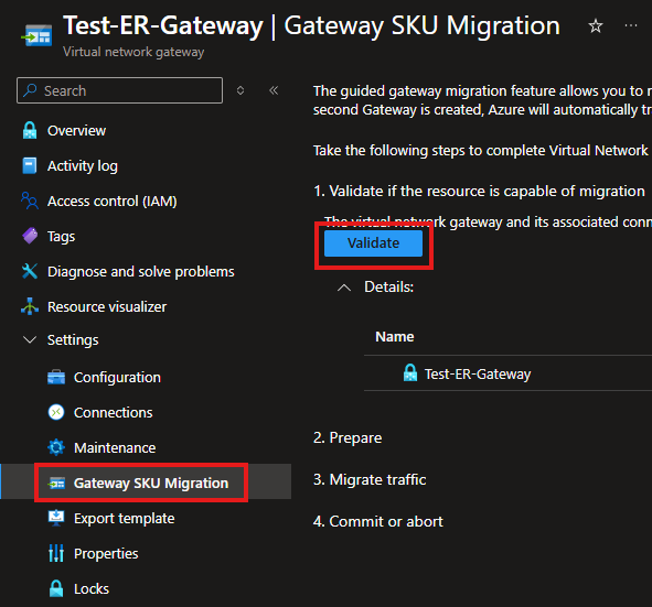 - 首先在ExpressRoute Gateway的菜单中找到迁移工具。点击“验证”。