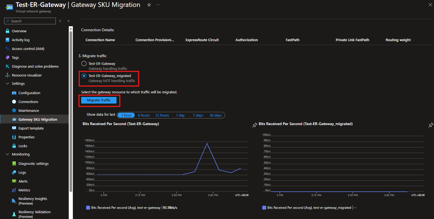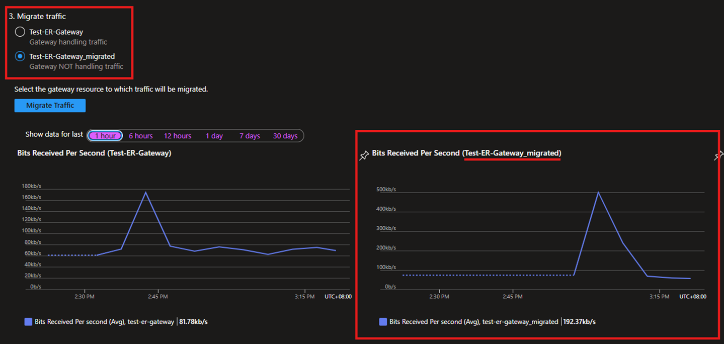 - 完成上面的连接迁移后,正常情况是,页面中会显示新的ExpressRoute Gateway已经在处理流量了,并且下面靠右手边的新ExpressRoute Gateway的图表中,也已经开始接收流量了。另外建议您也可以使用地端网络中的设备,与Azure中的VM来进行连通性测试。如果需要了解相关测试工具,可以参考文档使用 PsPing & PaPing 进行 TCP 端口连通性测试。