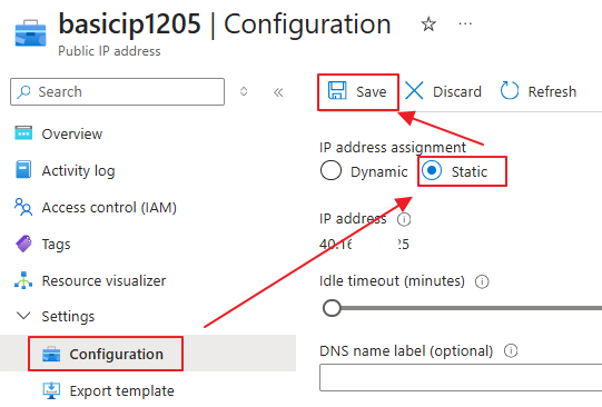 1、要升级的基本公共 IP 必须具有静态分配。 如果尝试升级动态分配的 IP 地址,则会收到一条警告,指出无法升级 IP。 在升级之前,将 IP 地址分配更改为静态。 标准 SKU 公共 IP 地址不支持动态 IP 分配,目前除了进行静态分配之外,没有其他替代选择。