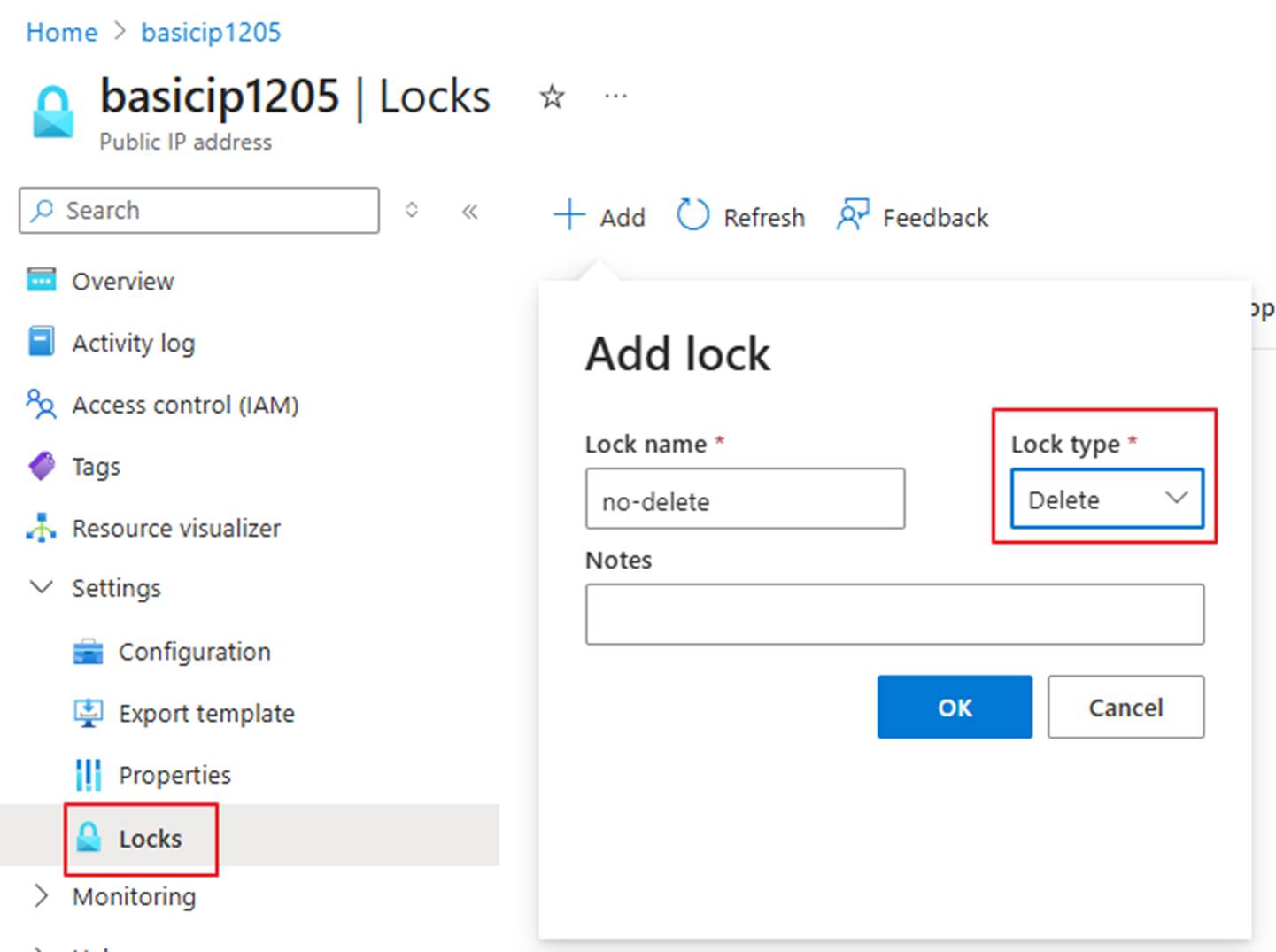 - 此步可选。为了防止发生意外将IP资源删除,您可以把公共IP资源添加防删除锁: