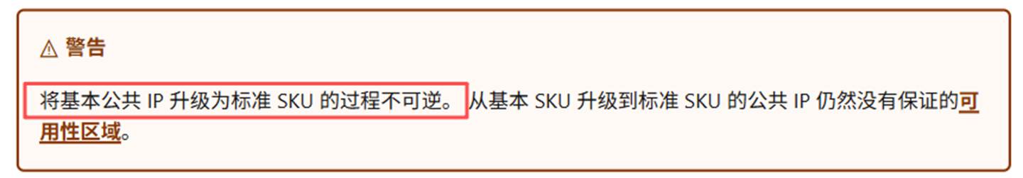 5、在大多数情况下,从基本 SKU 升级到标准 SKU 的公共 IP 继续没有 可用性区域。 这意味着它们不能与 Azure 资源相关联,该资源要么是区域冗余的,也不能与提供该区域的区域中预先指定的区域相关联。 (在极少数情况下,基本公共 IP 分配了特定区域,在升级到 Standard 时会保留此区域。